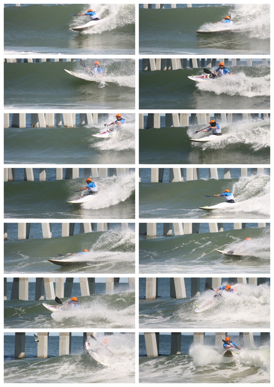 The two sequences below show the difference in hull speeds. Both paddlers are displaying the same accurate technique in trying to move along the wave face. However the boat on the left is unable to go fast enough to outrun the shoulder, wheras the boat on the right can continue surfing on the green face because of its superior speed.